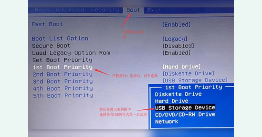 进入BIOS设置后,如下图用左右方向键移动到boot选项,然后在用上下方向键移动到“1ST boot priority”选项回车选中,在弹出来的框中回车选择带有USB字样的选项,按F10保存退出即可,接着再次开启电脑就会自动使用U盘启动。