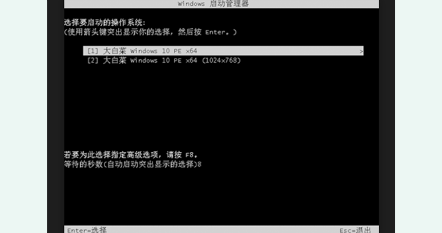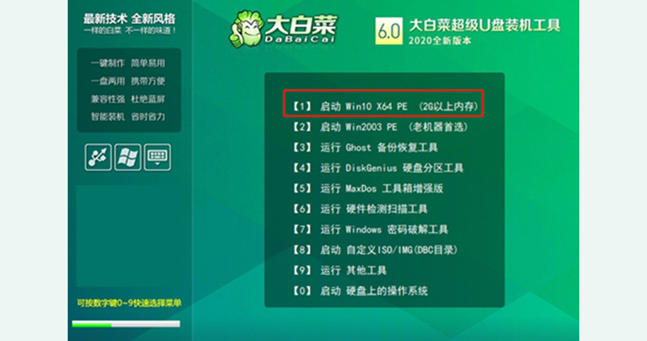 进入大白菜主菜单后,通过“↑↓”键选择“【1】启动Win10 X64PE(2G以上内存)”后回车确认,成功进入winpe。
